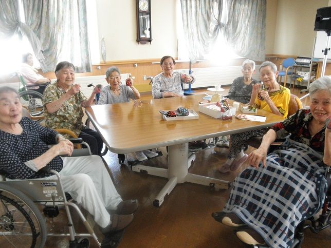 特養、デイサービスそれぞれで主旨をアナウンスして希望者を募ったところ、多くの皆さんの協力を得て、お手玉づくりが始まった。皆さん真剣に、かつ楽しそうにお手玉づくりに取り組んでいただいた。参加者の最高齢者は、97歳の女性である。